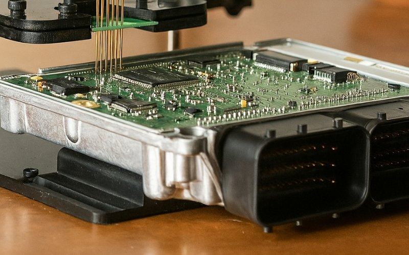 Es una prueba que se realiza fuera del vehículo. Conectamos el módulo a un banco de pruebas que simula las condiciones reales de funcionamiento, permitiendo detectar si el fallo proviene del módulo o de otro componente del sistema.